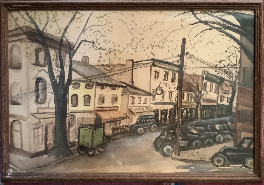 It was painted by Nina Evnin, the first wife of my father’s uncle, and dated 1947, the year my parents were married. My parents were, in fact, introduced through the joint efforts of Nina and my mother’s mother, Lillian Kruskal Oppenheimer. Nina and Lillian were good friends and had probably become acquainted owing to the business connections between their husbands, Oscar Evnin and Joseph Kruskal, both furriers in New York. After he was demobbed from the British Army in 1946, my father went from London to New York to learn the business from Uncle Oscar and, presciently, Nina and Lillian saw the potential for a match.