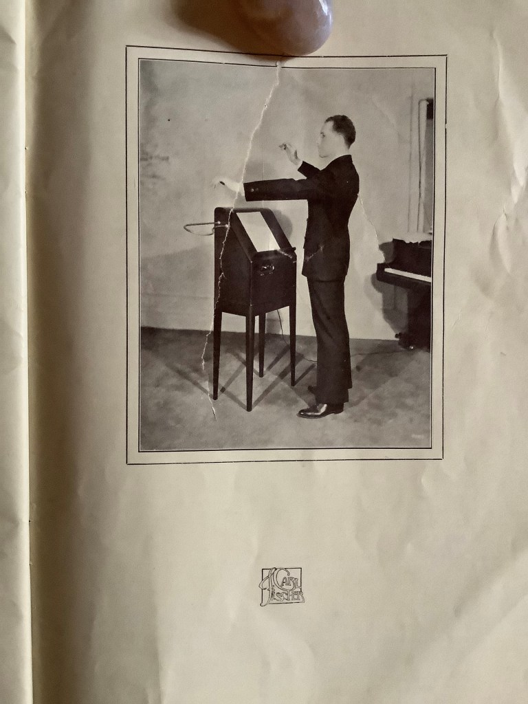 As I was writing this, I suddenly recalled that my grandmother, Lillian, herself owned a theremin! In fact, I have now convinced myself that I remember trying it out at a young age, though I suspect this is not a genuine memory. Whether or not I did, when I was old enough to care, Lillian no longer owned it. Surely she, and Nina, must have known Theremin and Rockmore. Perhaps, like Rockmore, her theremin was even given to her by its inventor. While I don’t have Lillian’s theremin, I do have, still in my possession, a book that probably belonged to my mother in the 1930s and 40s (she was a clarinetist of no mean accomplishment) that explains all the different musical instruments. It was invaluable to me in my own attempts at composition, giving the ranges of the different instruments, the clefs their parts are written in, and so on. It also had, for each instrument, a picture of someone playing it. Even as a teenager, I found the old-fashioned quality of these pictures remarkable. Truly up to the minute, the book includes the theremin.