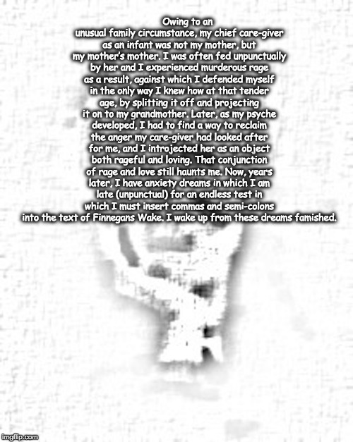 This was posted on Facebook on February 21st, 2016. It is the first of a group of memes that deal with being in analysis. (Mostly, in the memes, I use the term “analyst.” Here, for reasons I can no longer recall, I have used “therapist.” My preference for the term “analyst,” I fear, betrays a kind of seedy one-upmanship on my part – of which I am not proud! – as if to say, “I’m not talking about any old therapy but honest-to-goodness, genu-ine psychoanalysis.” I wonder if I wasn’t deliberately trying to slap down that tendency in myself by here going with “therapist.” Indeed, as I write this, I now feel I remember that very thought process.) I decided to omit the meme from the final tally because it is quite similar to, though not quite as good as, another, later meme. Continue reading “Excisions: 1”